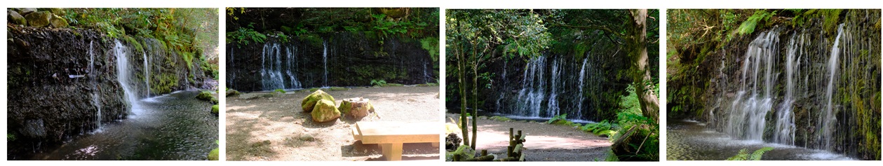 箱根登山鉄道小涌谷駅から舗装されたなだらかな坂を15分程登ると道は二股に分かれる。左側の道の横に千条の滝と書かれた標識があるので、標識に従って進もう。6~8分程で目の前に幅20メートル、高さ3メートル程の滝が現れる。4万年前に神山が崩れた時に堆積したものらしい。岩肌を幾筋もの水が流れ落ちる姿から千条の滝と言う名が付いた。